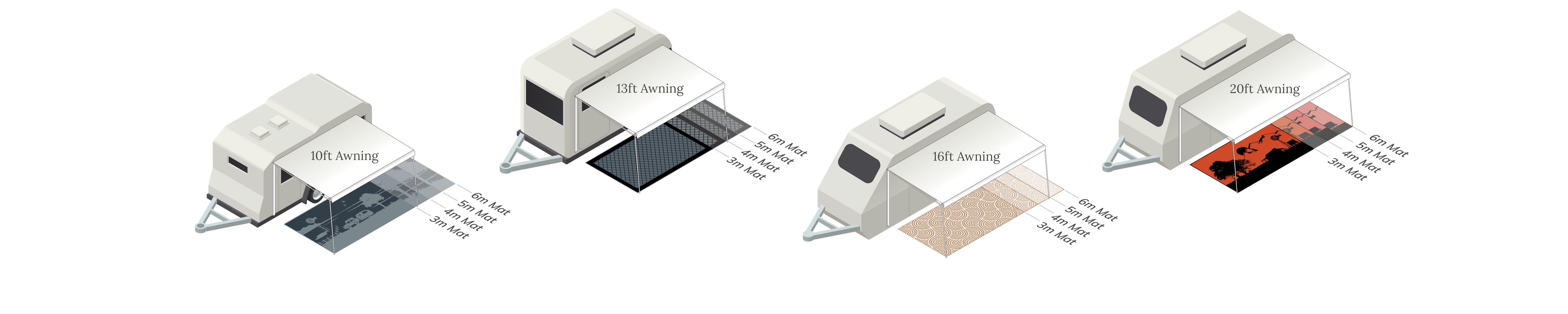 Choosing the right annexe mat can depend on your setup and the size of your awning. Our mats are 2.4m in width, with lengths ranging from 3m to 6m, making them suitable for most caravan awning configurations. Use the size guide below to find the perfect fit and transform your outdoor space into a comfortable outdoor haven.